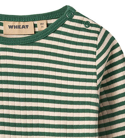 Magnifique blouse Wheat orné d'un motif rayé classique vert et beige clair. Wheat structure côtelée chemisier confère une allure élégante. chemisier est doté d'une ouverture pratique à À boutons poussoirs sur l'épaule gauche.