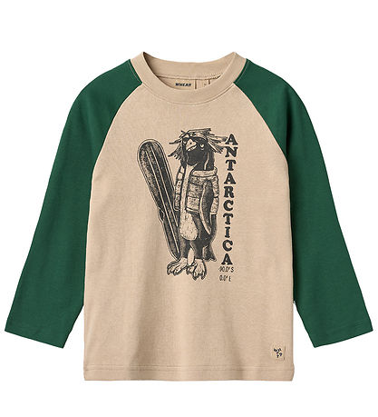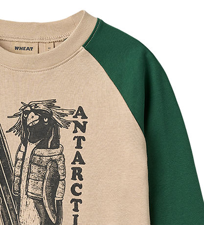 Magnifique blouse Wheat beige à manches raglan vertes, orné d'un joli imprimé sur le devant représentant un pingouin avec une planche de surf et un texte faisant référence à l'Antarctique. Le Wheat est discrètement placé en bas du devant.