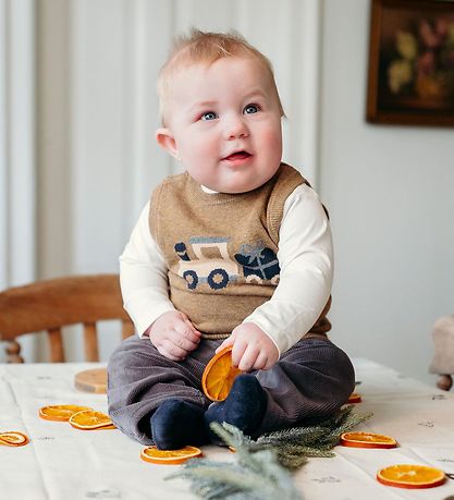 Magnifique blouson Hust and Claire dans une teinte marron chaude avec un fin imprimé de train représentant une calèche cadeau. Le design du gilet est idéal pour donner à votre enfant un look ludique et douillet.