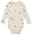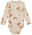 Délicieux justaucorps VACVAC en ivoire blanc avec un imprimé de gros croissants brun doré, à la fois entièrement colorés et sous forme de croquis. Le Justaucorps a une belle structure nervurée.