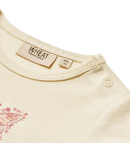 justaucorps Sweet Wheat beige avec imprimé d'un papillon rose sur la poitrine.