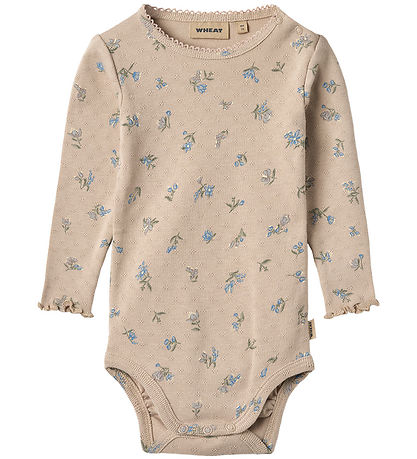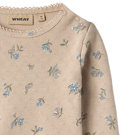 Adorable body Wheat beige clair orné d'un délicat motif floral imprimés le body les tons bleu et vert. Wheat est doté d'une ouverture pratique à À boutons poussoirs sur l'épaule gauche, ainsi que de délicats détails décoratifs tels qu'une fine bordure en dentelle le long de l'encolure et des bords ondulés aux poignets.
