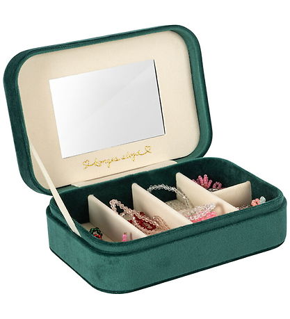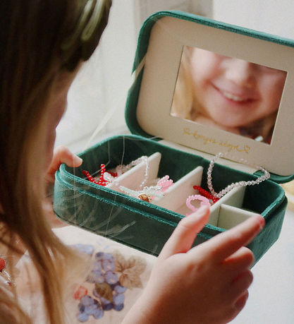 Le Konges Sløjd est inclinable et l'intérieur est doté d'un miroir. Ce Boîte à bijoux est divisé en cinq Rum de tailles différentes et contient de précieux bijoux ornés de petites perles roses, blanches et rouges.