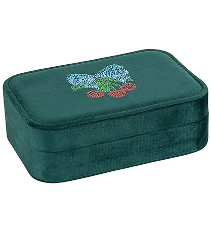 Magnifique boîte à bijoux Konges Sløjd en velours vert, et sur le couvercle il y a un motif avec des baies rouges et un noeud papillon bleu en paillettes.