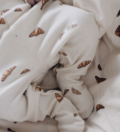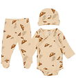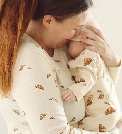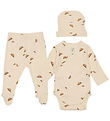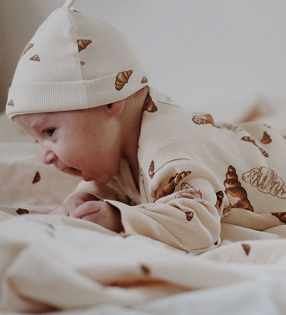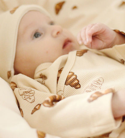 Magnifique boîte cadeau VACVAC contenant un body, un pantalon et un bonnet de couleur beige avec un imprimé de différents gros croissants dans des tons marron.