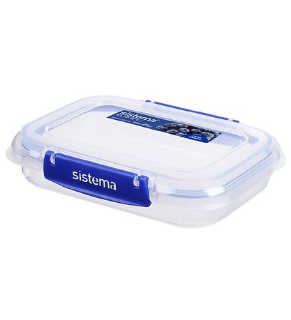 boîte à repas pratique Sistema en plastique transparent, avec clip bleu. La Boîte à repas a une capacité maximale de 450 ml.