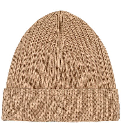 Élégant bonnet BOSS beige de couleur unie, en maille légère à structure côtelée. Bonnet est orné d'un discret logo BOSS brodé sur le devant. Bonnet présente une forme tour et un large pli sur le bord.