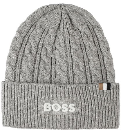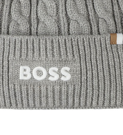 Magnifique bonnet BOSS gris chiné en chiné, orné d'un joli motif torsadé pour une allure classique. L'inscription « BOSS» est brodée en blanc sur le devant. Ce Bonnet est composé d'une seule épaisseur et présente un large pli sur le bord.