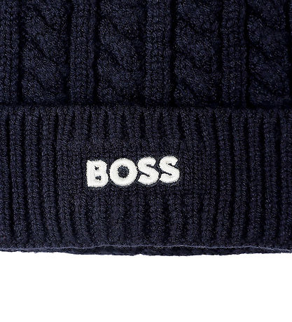 Magnifique bonnet BOSS marine en maille côtelée. Bonnet pom-pom lui confère une touche d'élégance. L'inscription « BOSS» est brodée en blanc sur le devant. Ce Bonnet pointu est composé d'une seule épaisseur avec un bord plié.