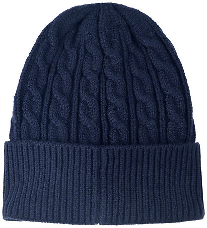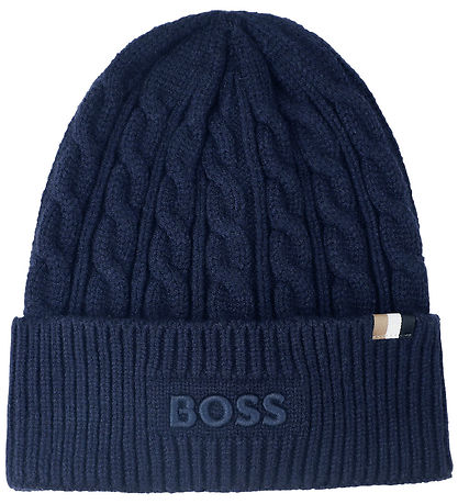 Élégant bonnet BOSS d'un bleu marine profond, en maille tricotée avec un joli motif torsadé lui conférant une allure classique. Bonnet en une seule épaisseur, il présente un large pli sur le bord.