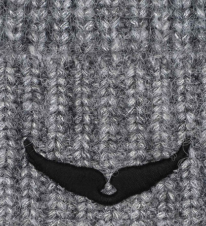 Joli bonnet de chez Zadig & Voltaire en gris chiné avec des argent brillant, et sur le devant il y a des paire noir brodées.