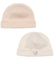 Élégants bonnets Fanga Fontana, disponibles en 2 Pack. L'un est de couleur crème clair avec un imprimé discret de deux chats, et l'autre arbore un motif rayé classique ivoire blanc et bleu clair.