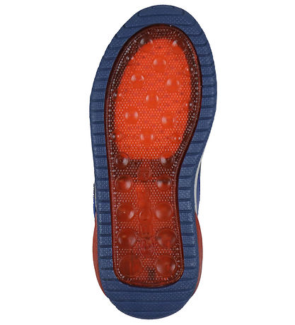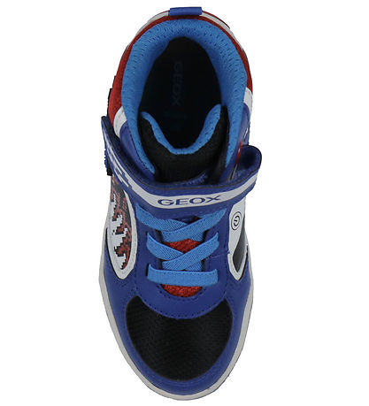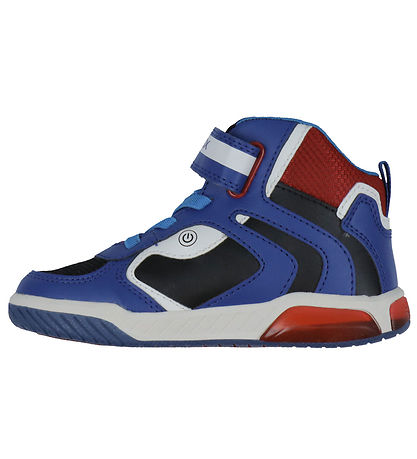 Superbes bottes clignotantes Geox en mesh et faux cuir aux tons bleu et rouge. Un dragon flamboyant est appliqué sur le côté. Ces bottes clignotantes sont équipées de LED au talon qui clignotent lorsque l'enfant marche ou court. LED s'allument de l'intérieur et ne sont pas rechargeables.
