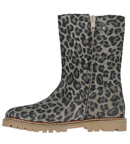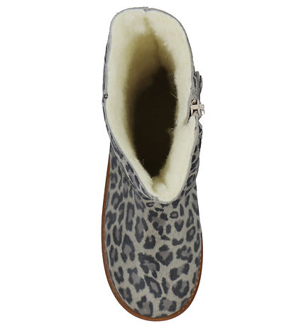 Bottes d'hiver élégantes Anguglus en daim avec imprimé léopard dans des tons de gris et de noir.