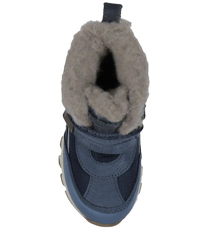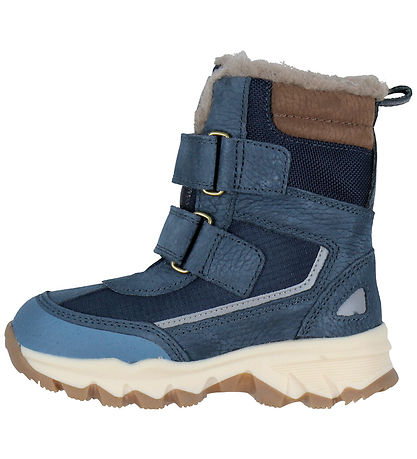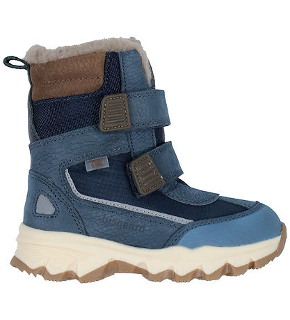 Magnifiques bottes d'hiver Bisgaard en cuir et textile aux tons bleu et marron, avec détails réfléchissants sur les côtés et le talon. Idéales pour garder vos pieds au chaud et à l'aise tout au long de l'hiver.