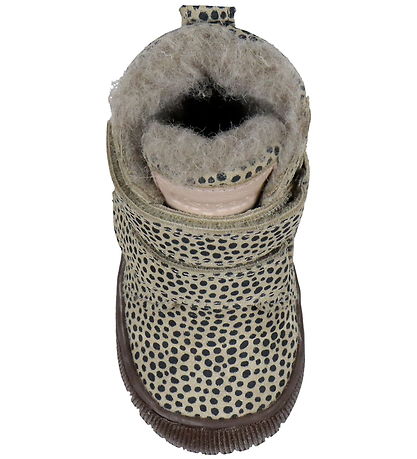 Bottes d'hiver élégantes Bisgaard en cuir beige à petits points noir. Logo rose sur la languette.