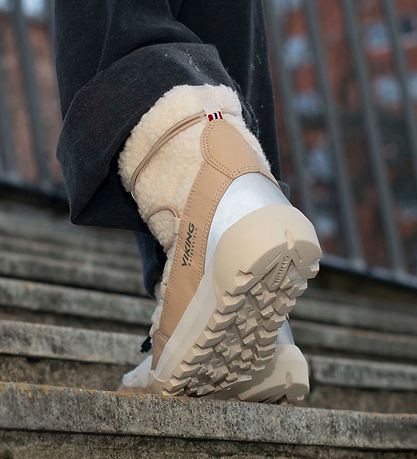 Bottes d'hiver Viking tendance en peluche beige et faux cuir. Bottes d'hiver arborent un logo gris à l'extérieur et un détail réfléchissant au talon.