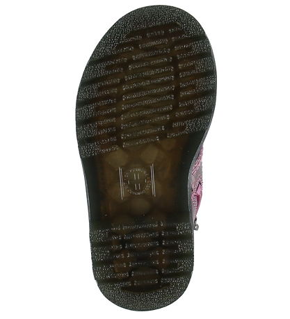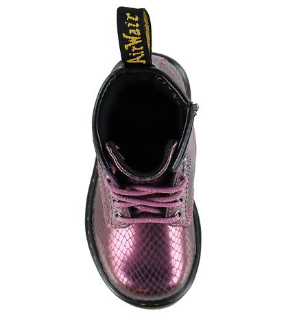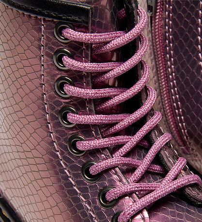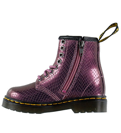 Adorables bottes Dr. Martens en cuir vernis avec un joli motif reptile en violet métallisé.