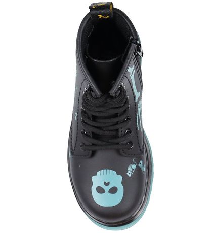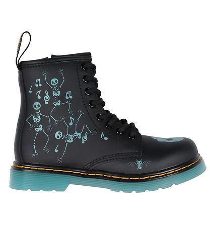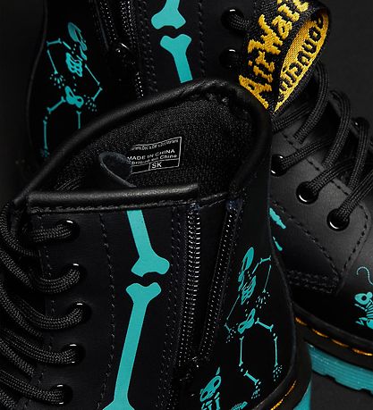 Cool Dr. bottes Dr. Martens en cuir noir avec revêtement et avec divers imprimé de squelettes et d'os en vieux bleu. Les semelles extérieures sont vieux bleu. À l'arrière se trouve la sangle classique noir et jaune, et elles présentent des coutures jaunes décoratives sur le bord de la semelle extérieure.