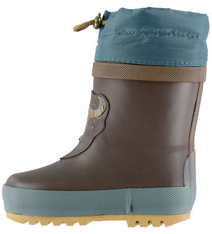 Bottes en caoutchouc Mikk-Line élégantes, marron foncé, avec des détails bleus sur le dessus et le dessous. Sur le devant, une application 3D représentant un bison. Un réflecteur est présent sur le talon et sur le côté, un logo rond également réfléchissant.