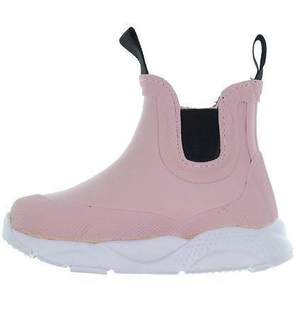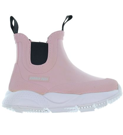 bottes en caoutchouc Fine Rubber Duck de rose avec le nom de la marque écrit à l'extérieur en blanc.