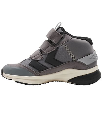 Boots fines Hummel en faux cuir et textile gris. Les Bottes ont des détails réfléchissants sur le talon et sur la languette, et un revêtement en caoutchouc est présent sur le devant de la pointe. À À l'intérieur et à l'extérieur se trouvent les chevrons Hummel caractéristiques en gris foncé.