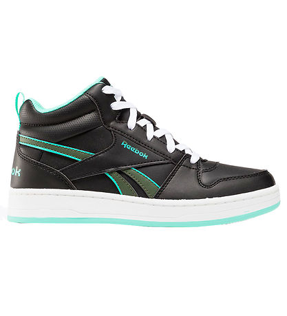Bottines Reebok élégantes en noir, faux cuir avec détails vert menthe et vert militaire et lacets blancs.