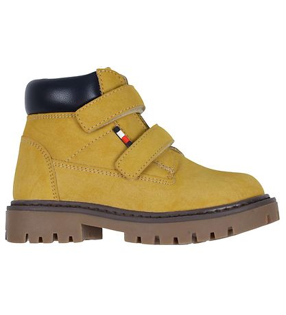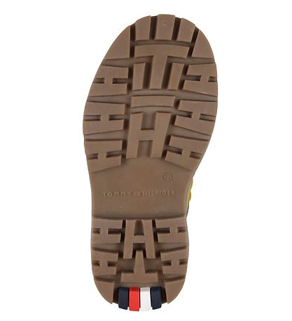 Jolies bottes Tommy Hilfiger en faux cuir marron clair, avec une teinte jaunâtre. Sur la languette se trouve un patch en caoutchouc noir avec le nom et le logo de la marque, et à l'extérieur il y a un petit logo en caoutchouc.