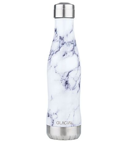 Belle bouteille thermos Glacial avec un aspect marbré fin en blanc et gris au look brillant. Il y a de acier en top et en bas.