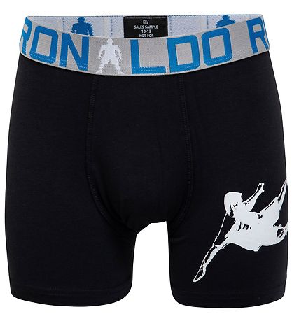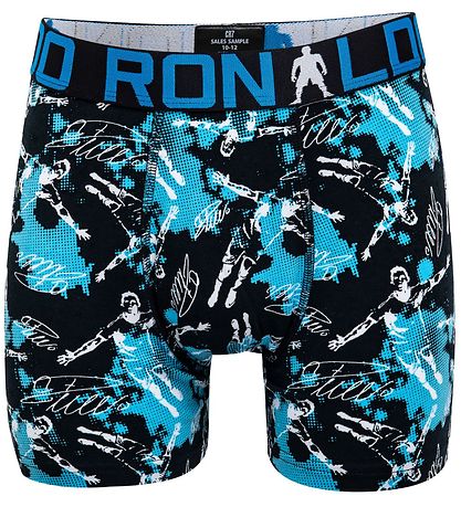 - Noir avec un imprimé complet motif, des imprimé blancs de Ronaldo et les signatures blanches de la star du football. Le bord élastique en haut est noir et porte le nom « Ronaldo» écrit en turquoise.