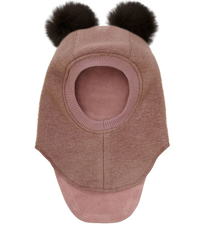 Élégante cagoule Huttelihut rose foncé, avec une forme tour et deux pompon en fourrure d'alpaga sur le dessus. Conçue en deux couches pour une isolation optimale, Cagoule est dotée d'un bord côtelé à l'ouverture pour un ajustement parfait.
