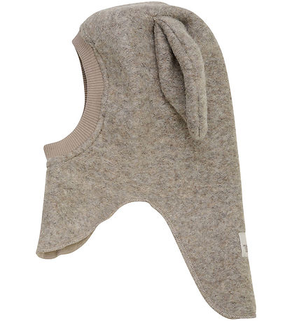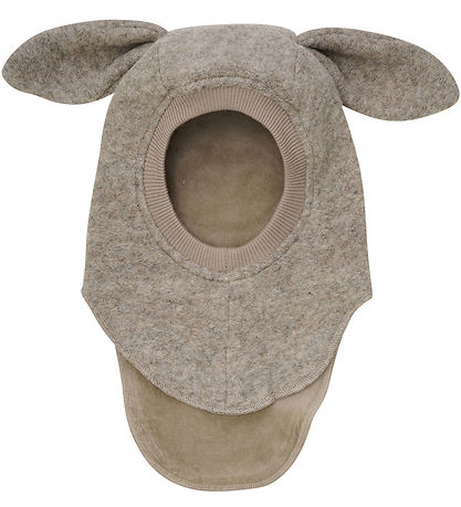 Élégante cagoule Huttelihut en polaire de laine chaude, couleur marron chiné. Huttelihut présente une forme tour avec de jolies oreilles et est composée de deux épaisseurs. Le bord côtelé au niveau du visage assure un confort optimal.