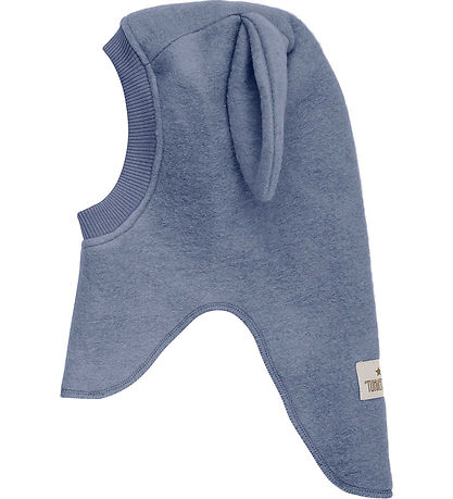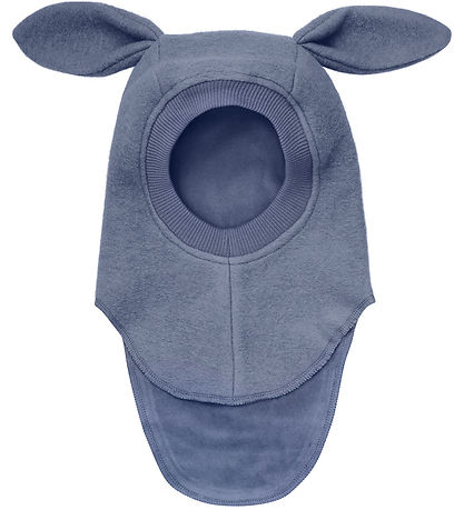 Élégante Huttelihut Huttelihut bleue, avec sa douce surface en laine polaire chaude. Composée de deux épaisseurs, elle présente une forme tour surmontée de longues oreilles de lapin.