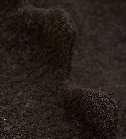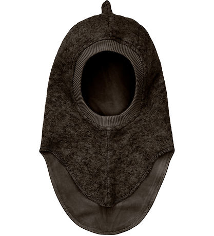Élégante Huttelihut Huttelihut en chiné de laine chaude, couleur marron foncé chiné. Composée de deux épaisseurs, cagoule présente une forme tour et des bords dentelés.