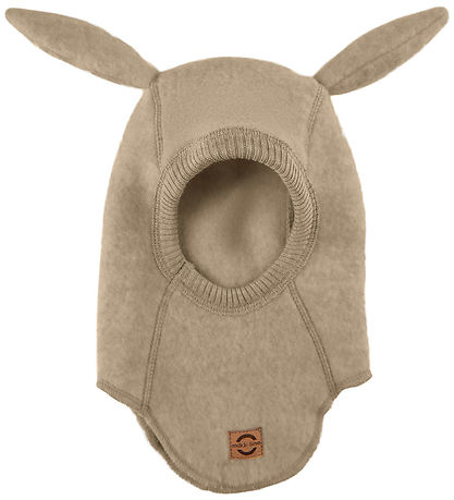 chapeau d'éléphant fin Mikk-Line en laine chiné de marron clair. Le Cagoule a de jolies oreilles de lapin sur le dessus et sous le menton se trouve une étiquette en cuir marron avec un logo Mikk-Line.
