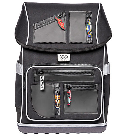Joli cartable Jeune Premier en noir avec pendentif voiture de course cool. Il y a des passepoils réfléchissants sur tous les côtés.