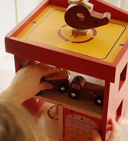 Fantastique caserne de pompiers de Konges Sløjd avec des voitures et un hélicoptère en bois peints en rouge et blanc et offrant des heures de plaisir.