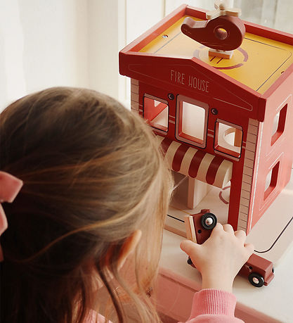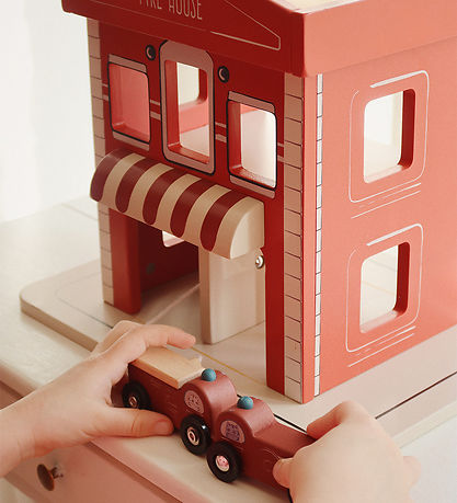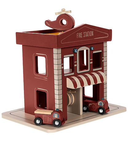 La Konges Sløjd dispose de plusieurs étages avec une piste d'atterrissage pour hélicoptère, une lance à incendie, une porte et un poteau de pompier, et comprend deux camions de pompiers avec des roues qui peuvent tourner et un hélicoptère de pompiers.
