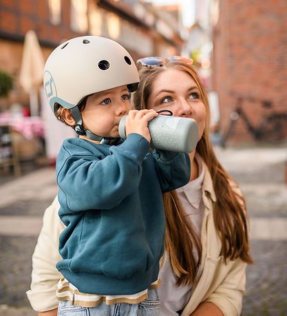 Le casque Scoot and Ride est fixé sous le menton avec des sangles réglables et une fermeture magnétique pratique, et sous le menton, les sangles sont rembourrées de polaire douce. Le casque peut également être attaché au cou, où se trouve une lampe LED rouge qui peut être allumée pour une visibilité supplémentaire dans la circulation.