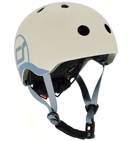 casque de vélo Cool Scoot and Ride en gris avec logos et sangles bleu.