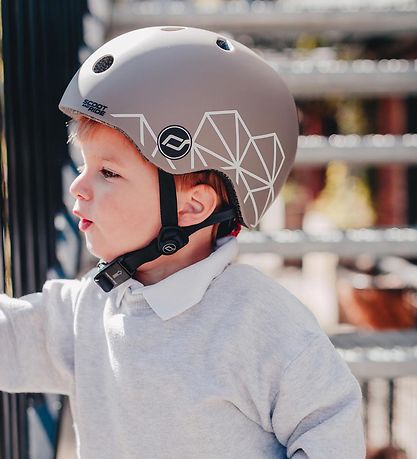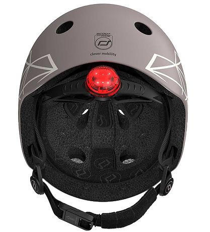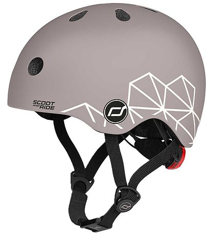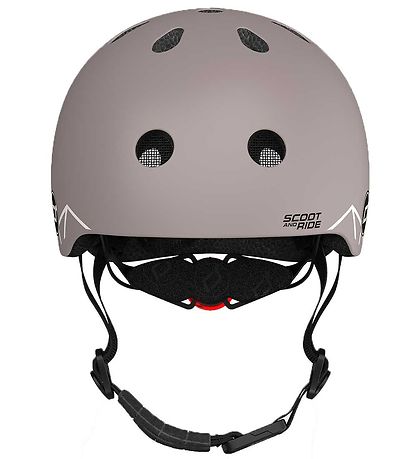 Le casque Scoot and Ride se ferme sous le menton grâce à des sangles réglables et une fermeture magnétique pratique. Le casque peut également être attaché autour du cou, où se trouve une lampe LED rouge qui peut être allumée pour une meilleure visibilité dans la circulation.