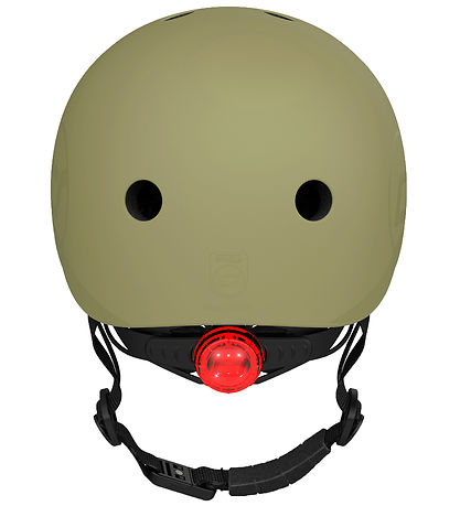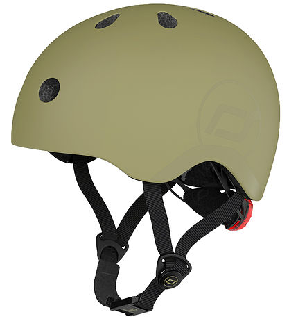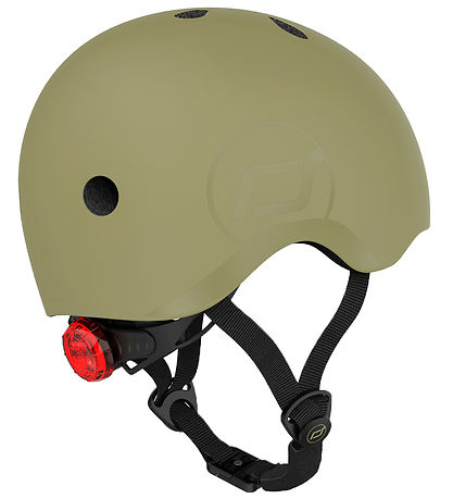 Le casque Scoot and Ride se ferme sous le menton grâce à des sangles réglables et une fermeture magnétique pratique. Le casque peut également être attaché autour du cou, où se trouve une lumière LED rouge qui peut être allumée pour une meilleure visibilité dans la circulation.
