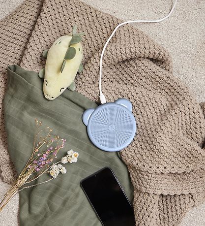 Chargeur sans fil Smart Kreafunk dans le modèle Paddy avec un design peluche bleu clair.