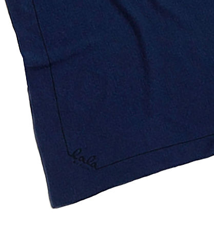 Adorable Écharpe Lala Berlin bleu foncé avec une étroite bande noire tout autour du bord, et à la pointe il est écrit " Lala Berlin".