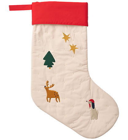 Belle chaussette de Noël Liewood en beige avec un bord rouge et des motifs de Noël chaleureux, pleins de couleurs, joliment brodés des deux côtés de la chaussette de noël.