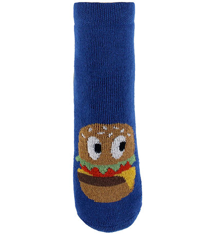 chaussettes Sjoe Melton en bleu, et sur le pied il y a un imprimé avec un hamburger.