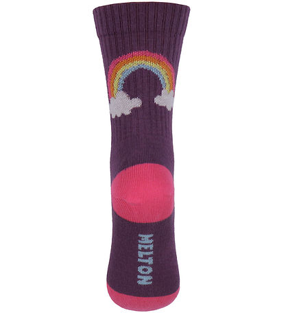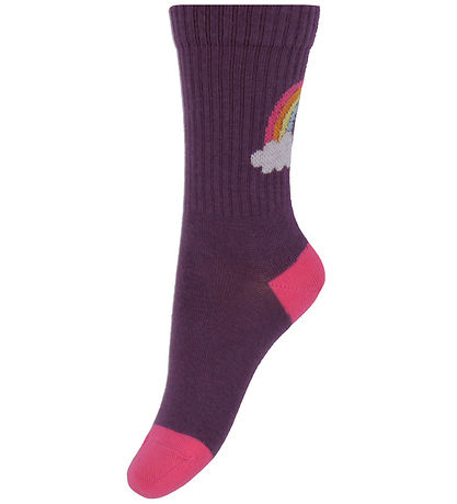 Charmantes chaussettes en Melton, avec une base violet foncé et des détails roses à la pointe et au talon. À l'arrière de la tige, un arc-en-ciel coloré orné d'un Sky. Le Chaussettes assure un bon maintien.