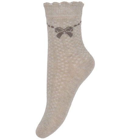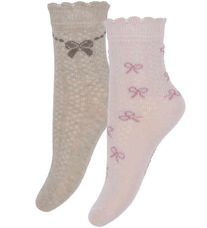 chaussettes fines Minymo vendues par 2 Pack. Une paire est beige chiné à points blancs et ornée d'un noeud papillon marron en haut de la tige, et l'autre paire est rose à points blancs et ornée de petits nœuds rose foncé.