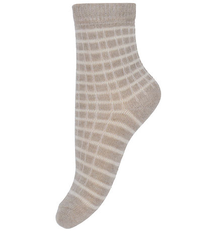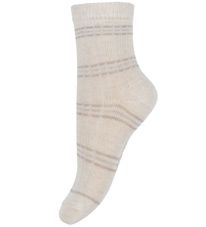 Jolies chaussettes Minymo vendues en 5 Pack avec cinq motifs différents en beige clair chiné avec des détails en marron clair et gris chiné.