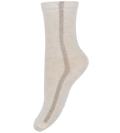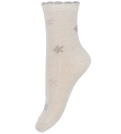 Jolies chaussettes Minymo vendues en 5 Pack dans cinq modèles différents en beige clair chiné avec des détails en marron, rose et argent avec des brillant.